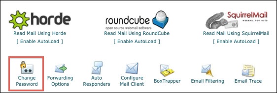 Click on the Change Password button from the navigation bar across the bottom of the window. Type your new password in both fields or use the Password Generator to have the system create a new mailbox password for you. Be sure to make a note of your new password. When you're ready, click the Change Password button.